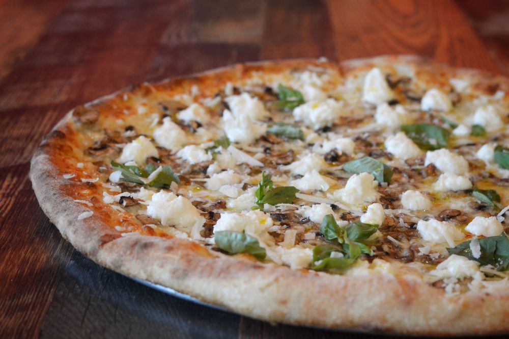 no sauce, mozzarella, garlic & mushrooms finished with ricotta, basil chiffonade, EVOO & grana padano cheese