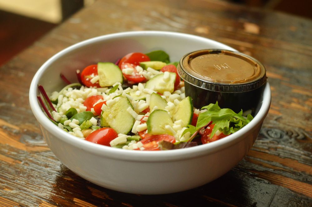Spring mix with cherry tomatoes, green pepper, sliced cucumber, chick peas, olives, mozzarella & a side of balsamic vinaigrette